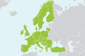 Austria, Belgium, Bosnia-Herzegovina, Bulgaria, Croatia, Czech Republic, Denmark, Finland, France, Germany, Great Britain, Greece, Hungary, Ireland, Italy, Lithuania, Luxembourg, Macedonia, Montenegro, Netherlands, Norway, Poland, Portugal, Romania, Serbia, Slovakia, Slovenia, Spain, Sweden, Switzerland, Turkey.
